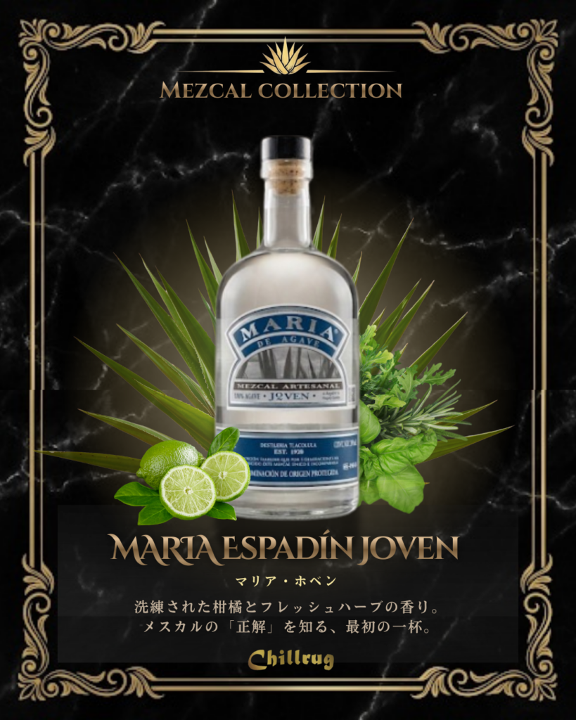 まず最初にご紹介するのは、青いラベルが美しい『MARIA(マリア)』。 「メスカルを飲んだことがない」という方に、最初の一杯として強くおすすめしたいボトルです。