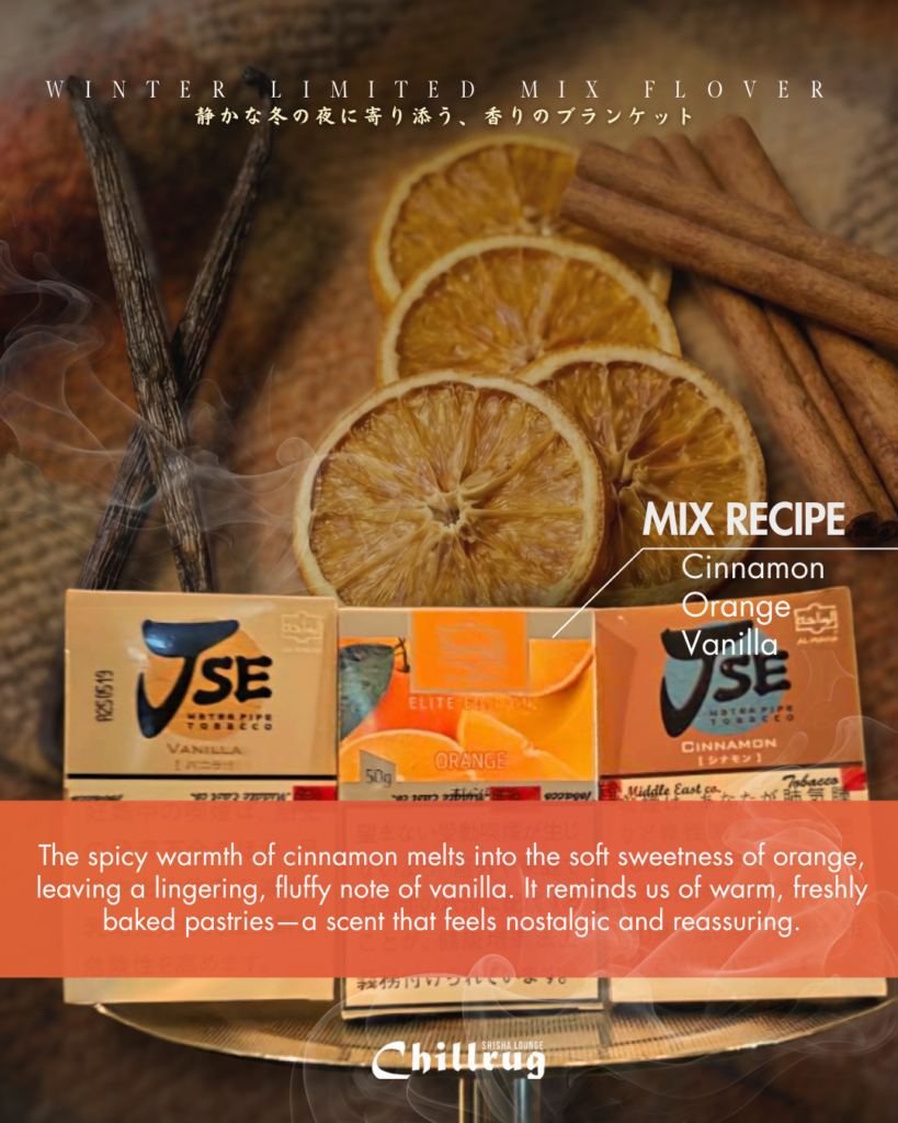 Tonight, we introduce a classic winter blend that gently warms your cold body, like a cozy blanket for a quiet night. “A blanket of fragrance that snuggles up to a quiet winter night.” The spicy warmth of cinnamon melts into the soft sweetness of orange, leaving a lingering, fluffy note of vanilla. It reminds us of warm, freshly baked pastries—a scent that feels nostalgic and reassuring. Seeking comfort rather than flashiness. We invite you into an elegant and calm world of fragrance woven by sweetness and spice. Please enjoy a slow, relaxing time in our warm lounge.